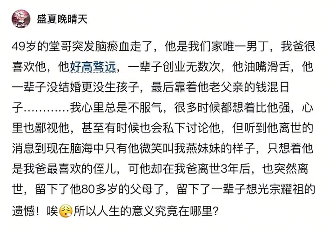 以上是一位女网友发帖描述去世的堂哥,描述他“好高骛远,油嘴滑舌”,一辈子创业无数次,最后靠着老父亲的钱混日子,留下了一辈子想光宗耀祖的遗憾。