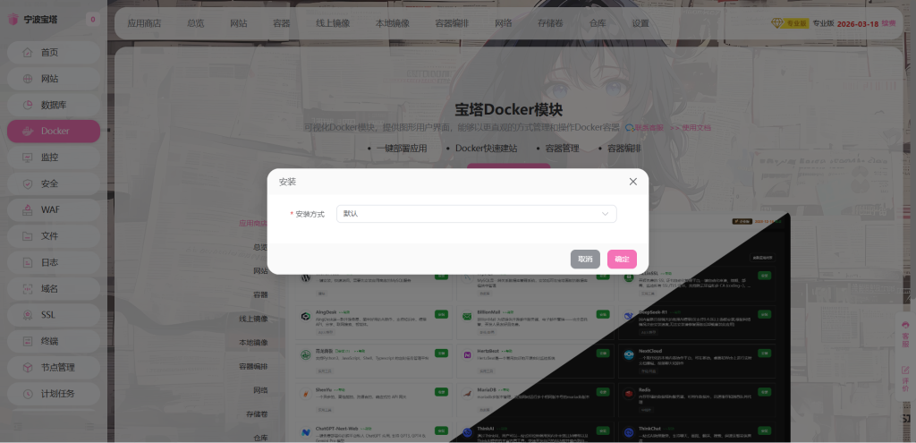 只介绍两种方法,宝塔docker一键安装和脚本安装。