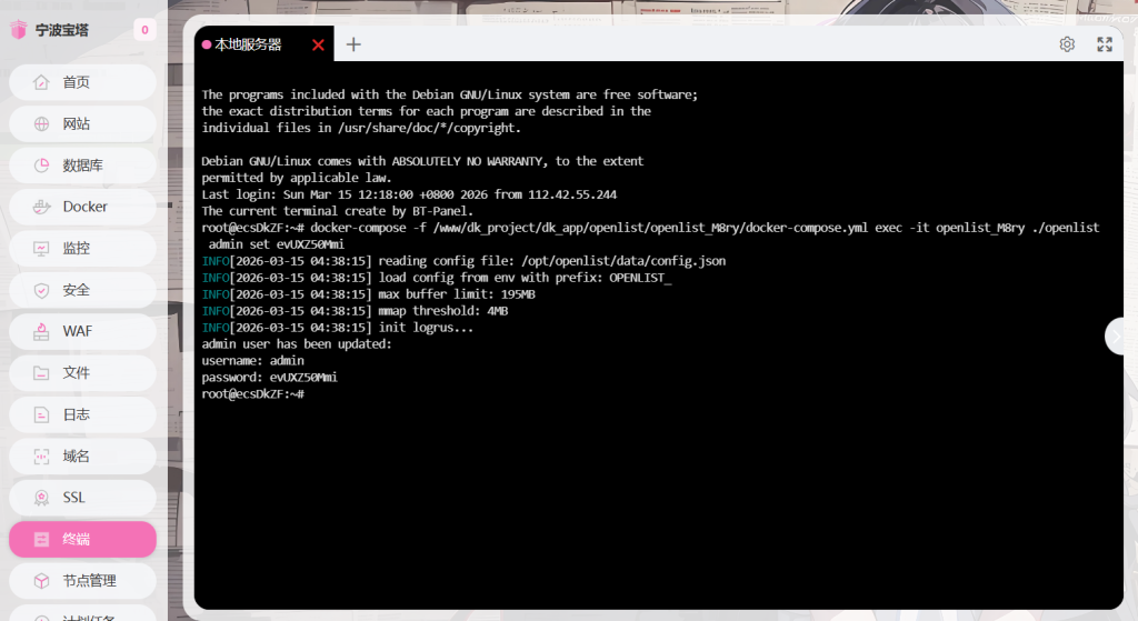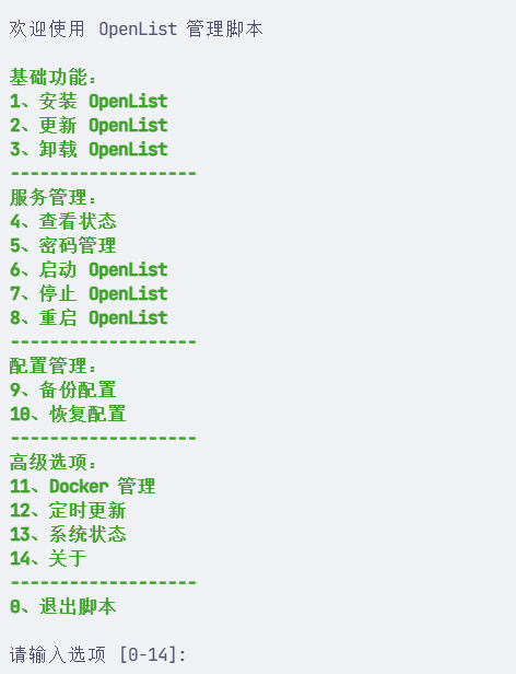 后续在终端输入openlist即可完成更新、卸载、重启等操作