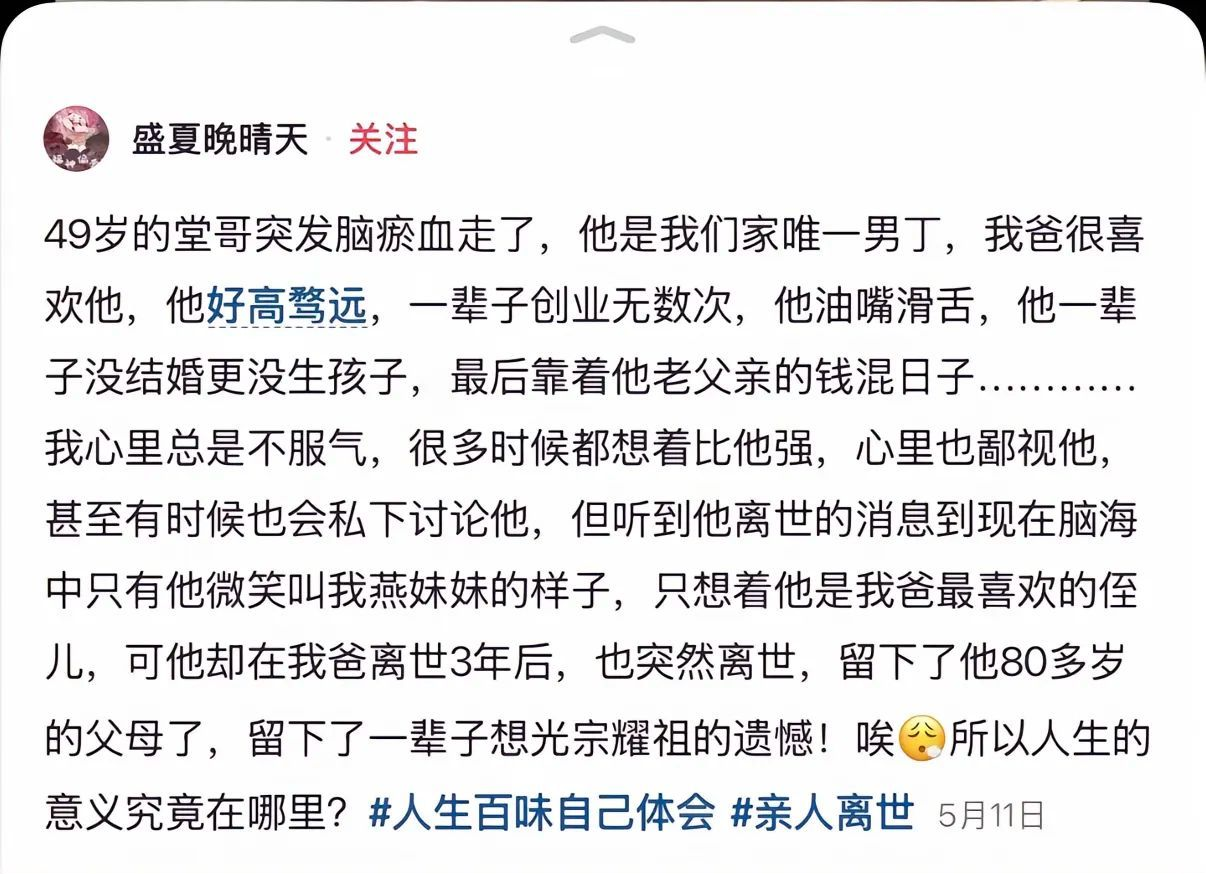 以上是一位女网友发帖描述去世的堂哥,描述他“好高骛远,油嘴滑舌”,一辈子创业无数次,最后靠着老父亲的钱混日子,留下了一辈子想光宗耀祖的遗憾。