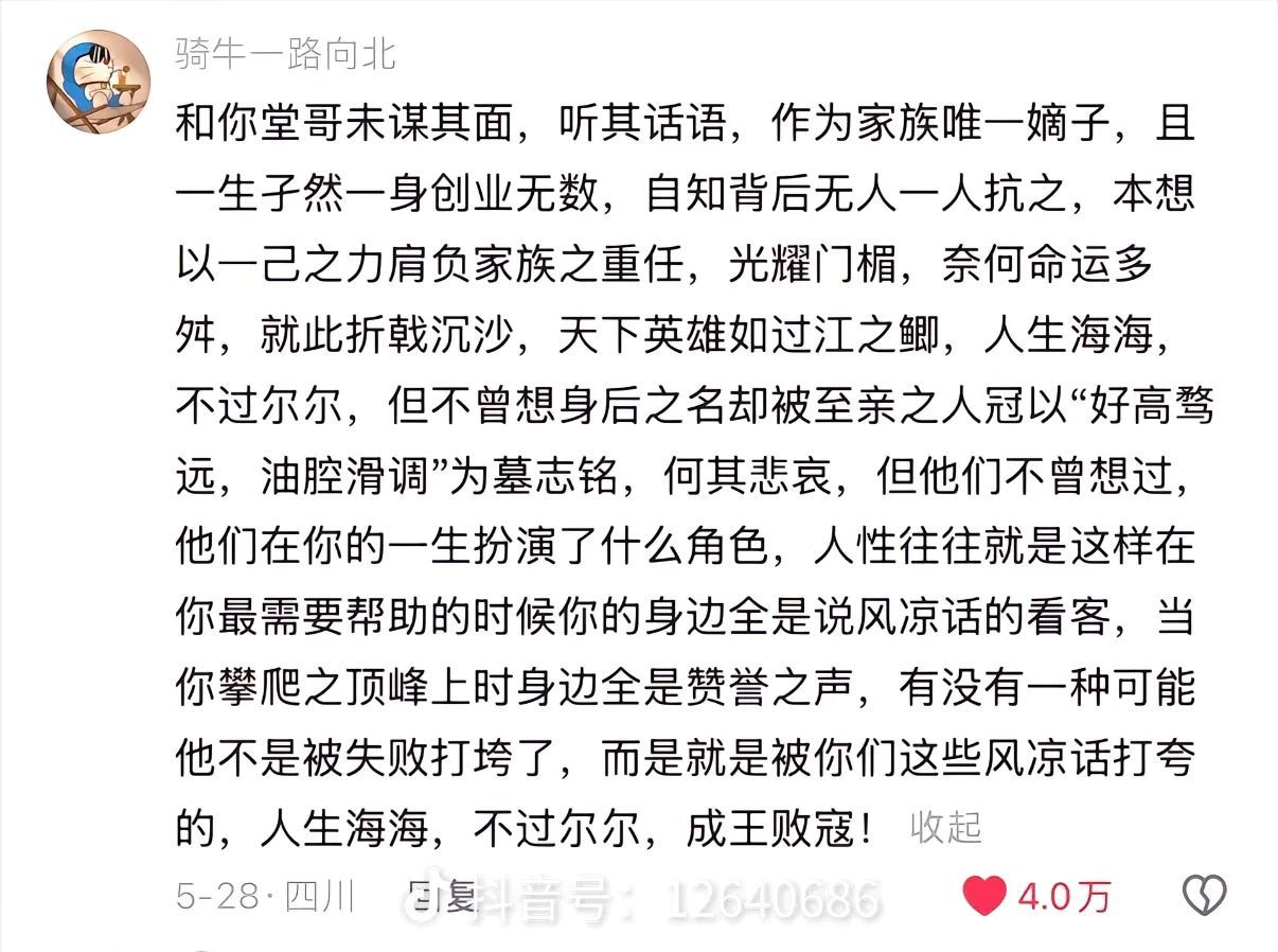 敬堂哥,创一代何其艰苦,背负着成功就是高瞻远瞩,能说会道;失败则是好高骛远,油腔滑调,多少创业者终其一生不过是为了家族后辈不再为生计发愁,不再让小辈远赴他乡,故而人生海海,不过尔尔,成王败寇