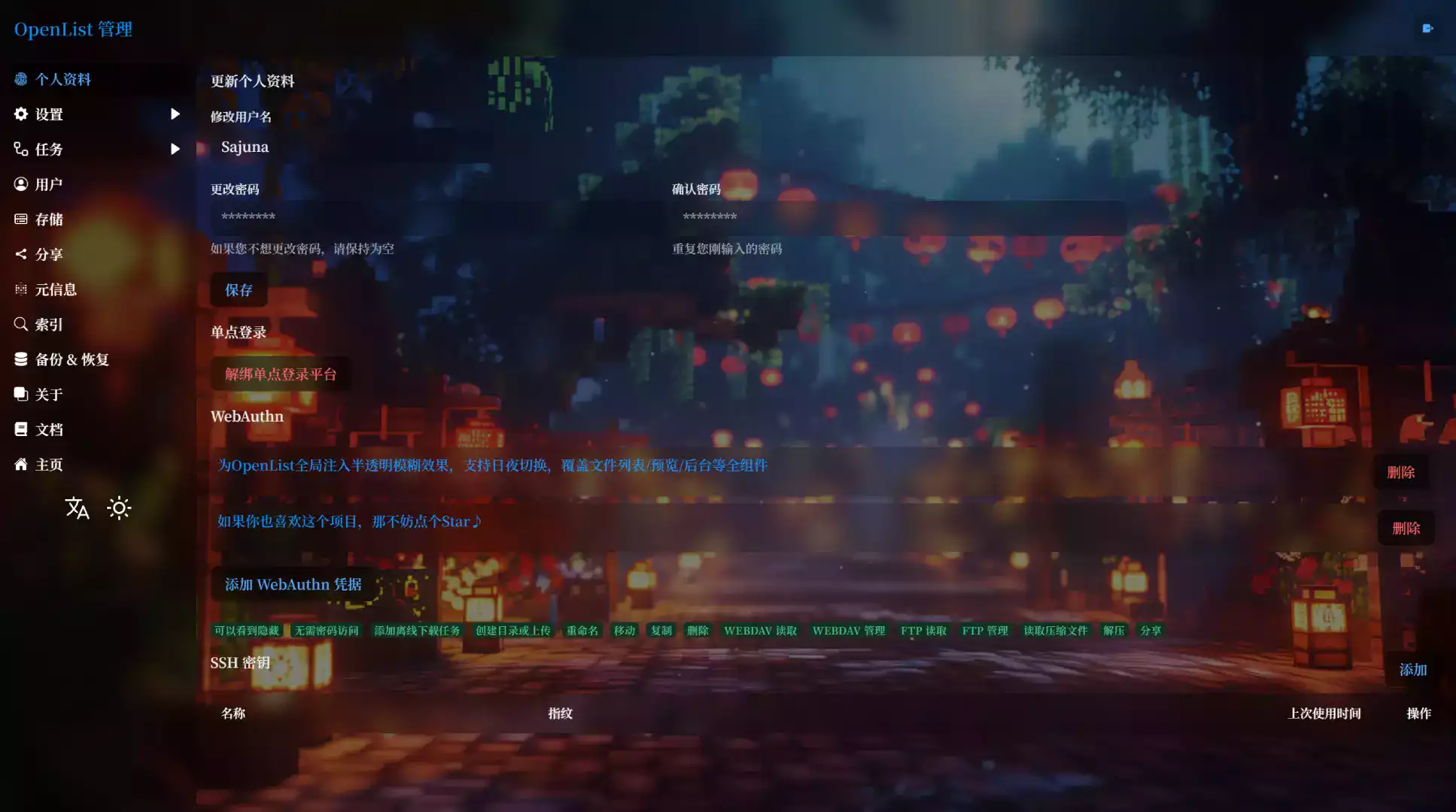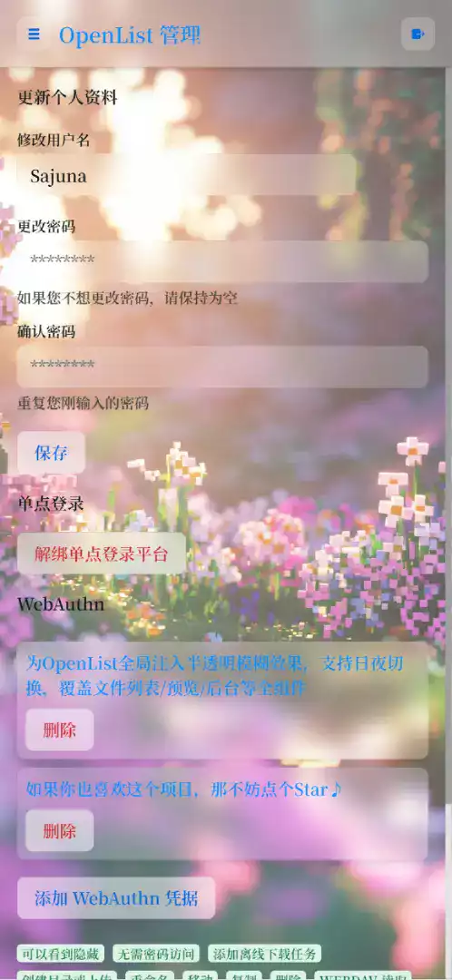 为OpenList全局注入半透明模糊效果,支持日夜切换,覆盖文件列表/预览/后台等全组件